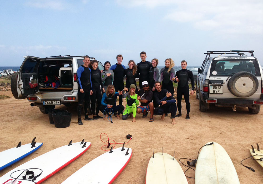Mit dem Surfjeep geht es dann direkt an den North Shore, auf der Suche nach dem besten Spot. Hier wird dann jedem Surfanfänger schnell klar, warum es ratsam ist, nicht auf eigene Faust ins Line Up loszuziehen. Fast alle Spots am North Shore sind Reef Breaks; also Surf Spots, bei dem die Wellen auf einem Riff brechen. Dementsprechend gibt es viele Spots, die zwar leicht aussehen, dem Surfer aber viel Können abverlangen. Die beiden Surflehrer Alejandro (Inhaber der O’Neill Surf School) und Gloria kennen sich am North Shore bestens aus und zeigen den Kursteilnehmern alle Tipps und Tricks, wie man perfekt ins Line Up kommt. Dort angelangt steht dem Surfvergnügen nichts mehr im Wege. Die hervorragenden Surfbedingungen garantieren eine steile Lernkurve und auch Neueinsteiger sind nach kurzer Zeit in den grünen Wellen zu finden. Im Anschluss an den Surfkurs geht es dann zurück nach Corralejo auf einen abendlichen Abstecher in eine der kultigen Surfbars.